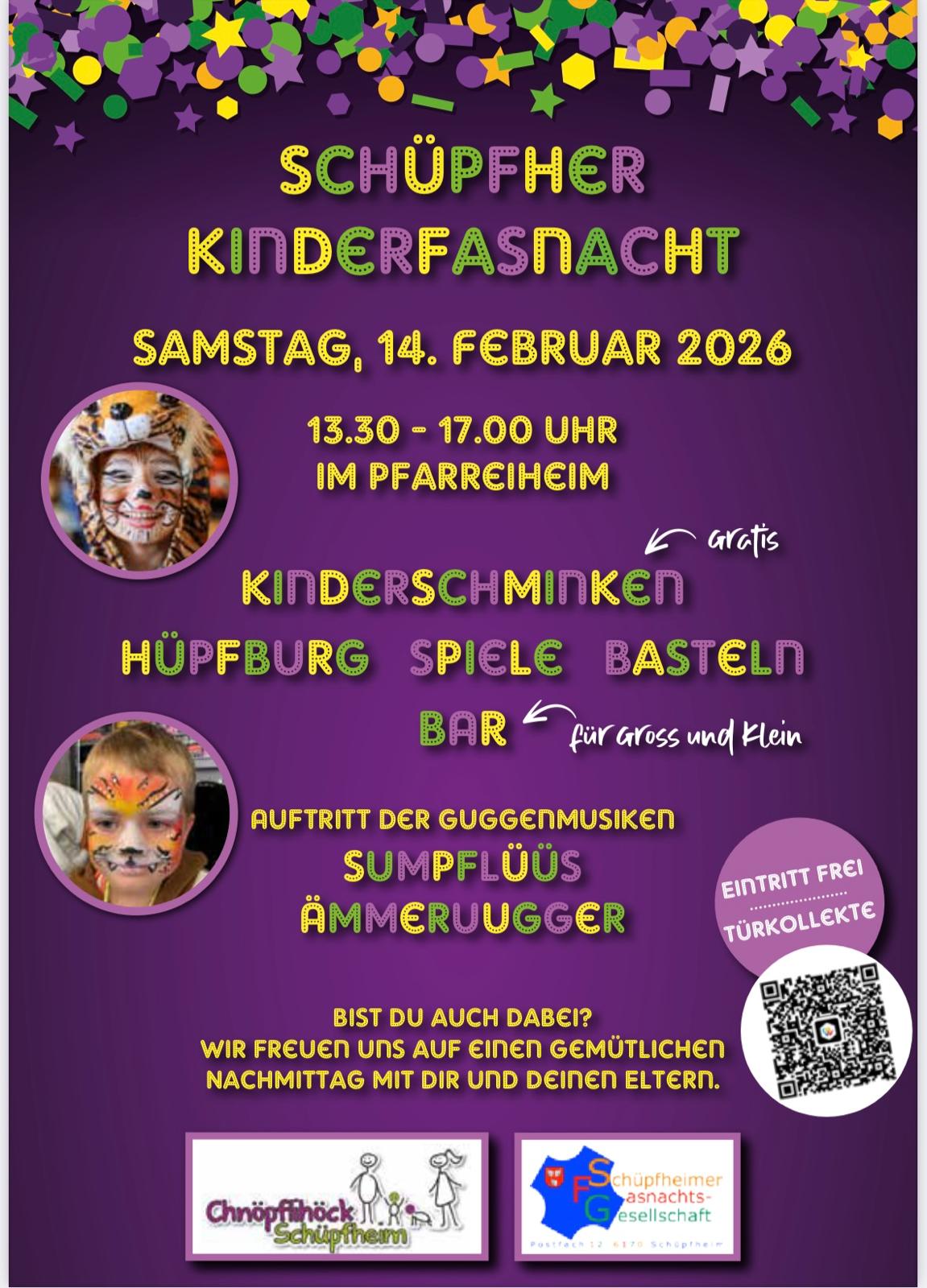 Kinderfasnacht 2026 11. Januar 2026 / Lucia Schenker / Keine Kommentare WICHTIG:Während den beiden Fasnachtsferien 2026 haben wir geschlossen und freuen uns über euren Besuch an unserer Kinderfasnacht vom Samstag, 14. Februar 2026 in Schüpfheim!